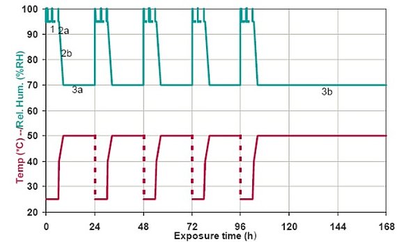 Po 5 opakováních nastává 48 hodinový cyklus simulující víkend – konstantní klima 50°C a 70%RH. Celkový průběh týdenního testu je zobrazen na obrázku 5.